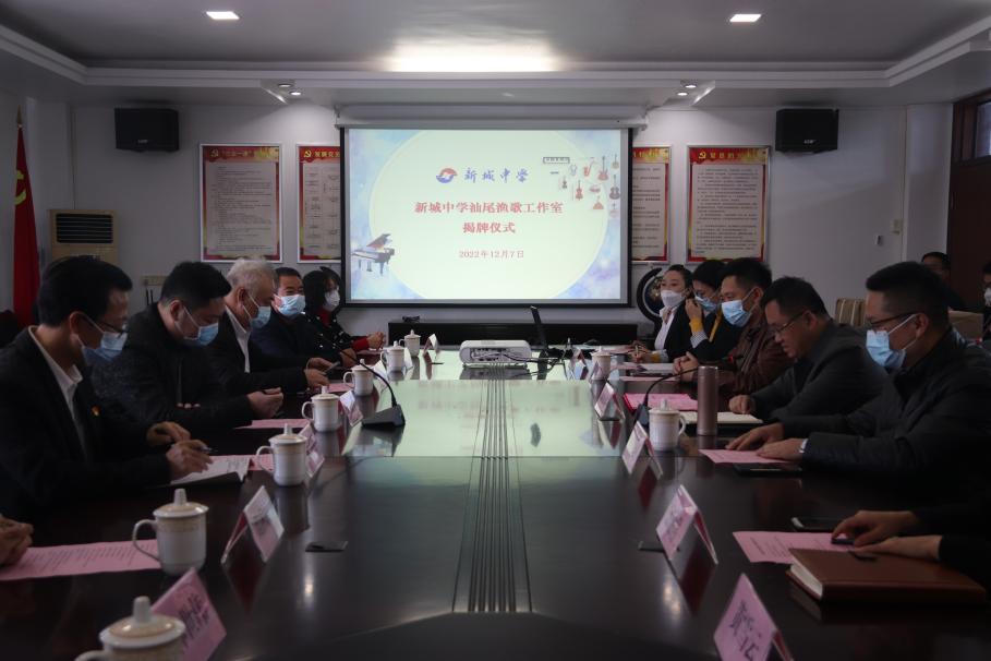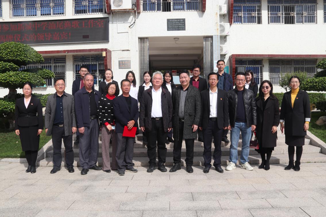 2022年12月7日上午,新城中學汕尾漁歌工作室揭牌儀式在我校舉行。廣東省音樂家協會主席團成員、汕尾市文聯兼職副主席、汕尾市音樂家協會主席何曉霧同志,汕尾市城區文化廣電旅游體育局局長黃超同志,汕尾市城區教育局副局長徐子岳同志,黃琛老師家屬黃文強先生、魏雪娟女士、林世偉先生,汕尾市音樂家協會副秘書長魏秋霞同志,汕尾市城區文化廣電旅游體育局文化廣電股股長田務紀同志,汕尾市城區文化館館長林立名同志,新城中學副校長邱如君同志、彭海威同志以及新城中學音樂組全體老師出席本次活動。新城中學黨總支書記、校長林禮祝同志主持活動。