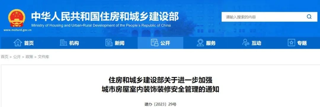 為進一步加強城市房屋室內(nèi)裝飾裝修安全管理,堅決遏制室內(nèi)裝飾裝修違法違規(guī)行為,保障人民群眾生命財產(chǎn)安全,維護社會和諧穩(wěn)定,根據(jù)《中華人民共和國建筑法》《建設(shè)工程安全生產(chǎn)管理條例》《建設(shè)工程質(zhì)量管理條例》《物業(yè)管理條例》《住宅室內(nèi)裝飾裝修管理辦法》等法律法規(guī)規(guī)章規(guī)定,近日,住房和城鄉(xiāng)建設(shè)部印發(fā)《關(guān)于進一步加強城市房屋室內(nèi)裝飾裝修安全管理的通知》。
